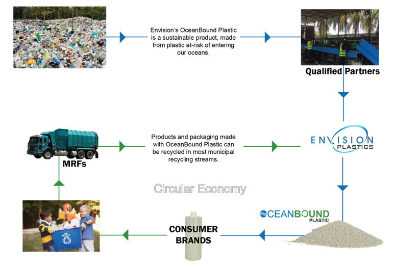 Plastic obtained from Qualified Partners and verified as originating in the At-Risk Zone meets Envision’s criteria as OceanBound Plastic source material. Envision has combined supply chain experience with technical expertise and patented processes to transform plastic at-risk of polluting our oceans into a reliable resin, OceanBound Plastic.